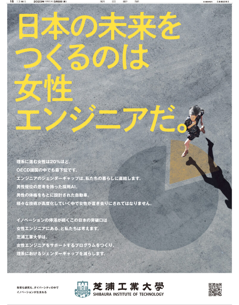 2023.07.31朝日広告賞 新聞広告の部〈広告主参加〉において堀籠 正樹 制作の学校法人 芝浦工業大学〈日本の未来をつくるのは女性エンジニアだ。〉が教育・公共 部門賞に選ばれました。