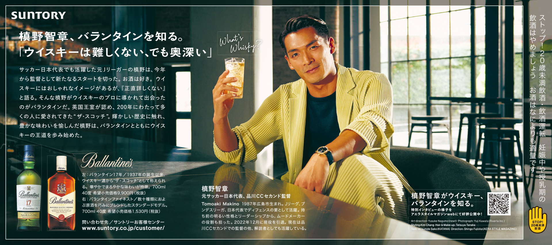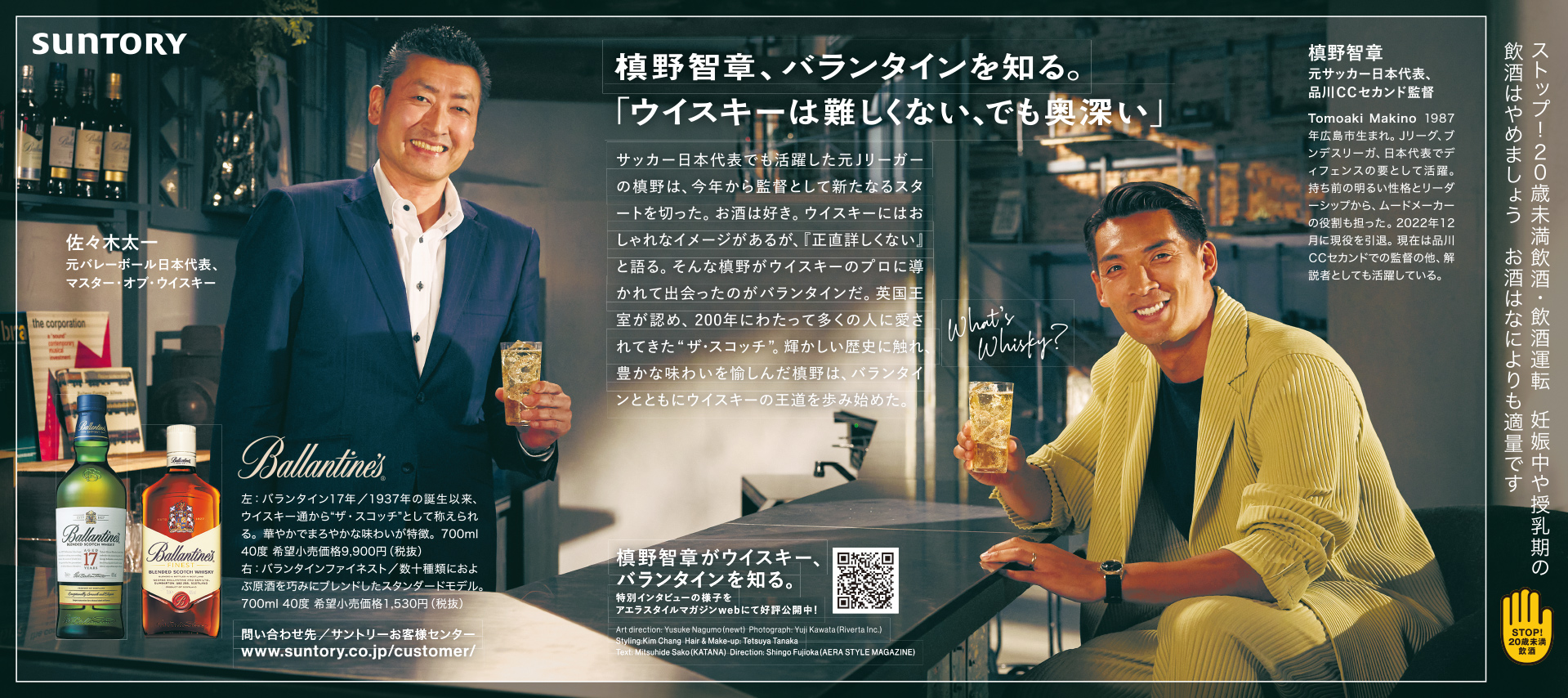 2021年に続くバランタイン×AERA STYLE MAGAZINEタイアップ企画の第二弾。ファイネストの潜在顧客であるウイスキーエントリー層に対し、バランタインブランドの王道たる所以を、ファクトとともに丁寧に伝える企画。今回は、元サッカー日本代表の槙野智章氏と元バレーボール日本代表でサントリーのウイスキー事業部シニアスペシャリストの佐々木太一氏の対談を軸に構成。ウイスキーはあまり詳しくないと言う槙野氏が本企画を通じてバランタインに魅了されていく様子を、新聞・WEB・動画を活用し余すところなく記録した。またファイネストはカジュアルに愉しめるお酒であることも強調したかったため、柔らかな自然光の演出には徹底的にこだわった。映像監督は福村昌平氏。