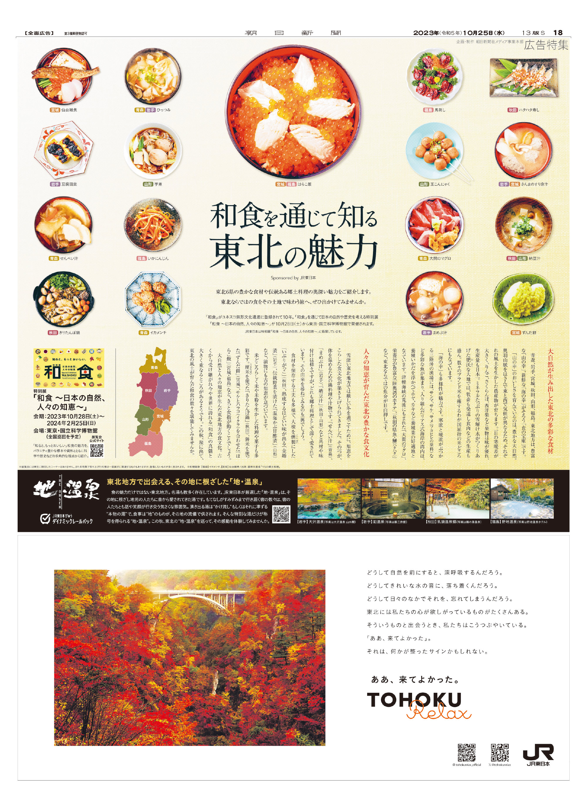 JR東日本「特別展 和食」コラボレーション企画。6月初めの提案ゲラから始まり4カ月後に掲載にいたった。紙面でJR東日本で行く東北の魅力を、東北地方の和食や地・温泉(THE ONSEN)で紹介した。後に新聞協会の2023年紙面アーカイブに保存されることになった。