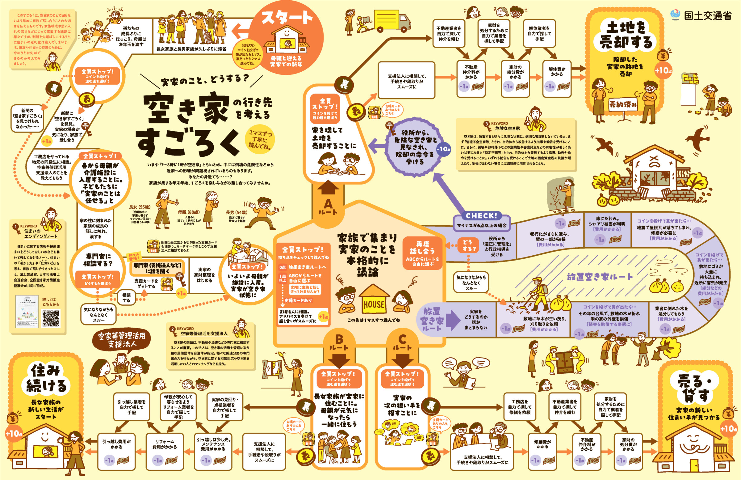 家族が集まる年末年始に、空き家について自然と話題にできるきっかけをつくるために制作した「空き家すごろく」。空き家にまつわるリアルな課題を、イラストを交えて楽しくキャッチーに学べるようデザイン。重くなりがちなテーマを、遊びながら理解できる体験型ツールとして構築し、第73回朝日広告賞・特別賞にも入賞した。
