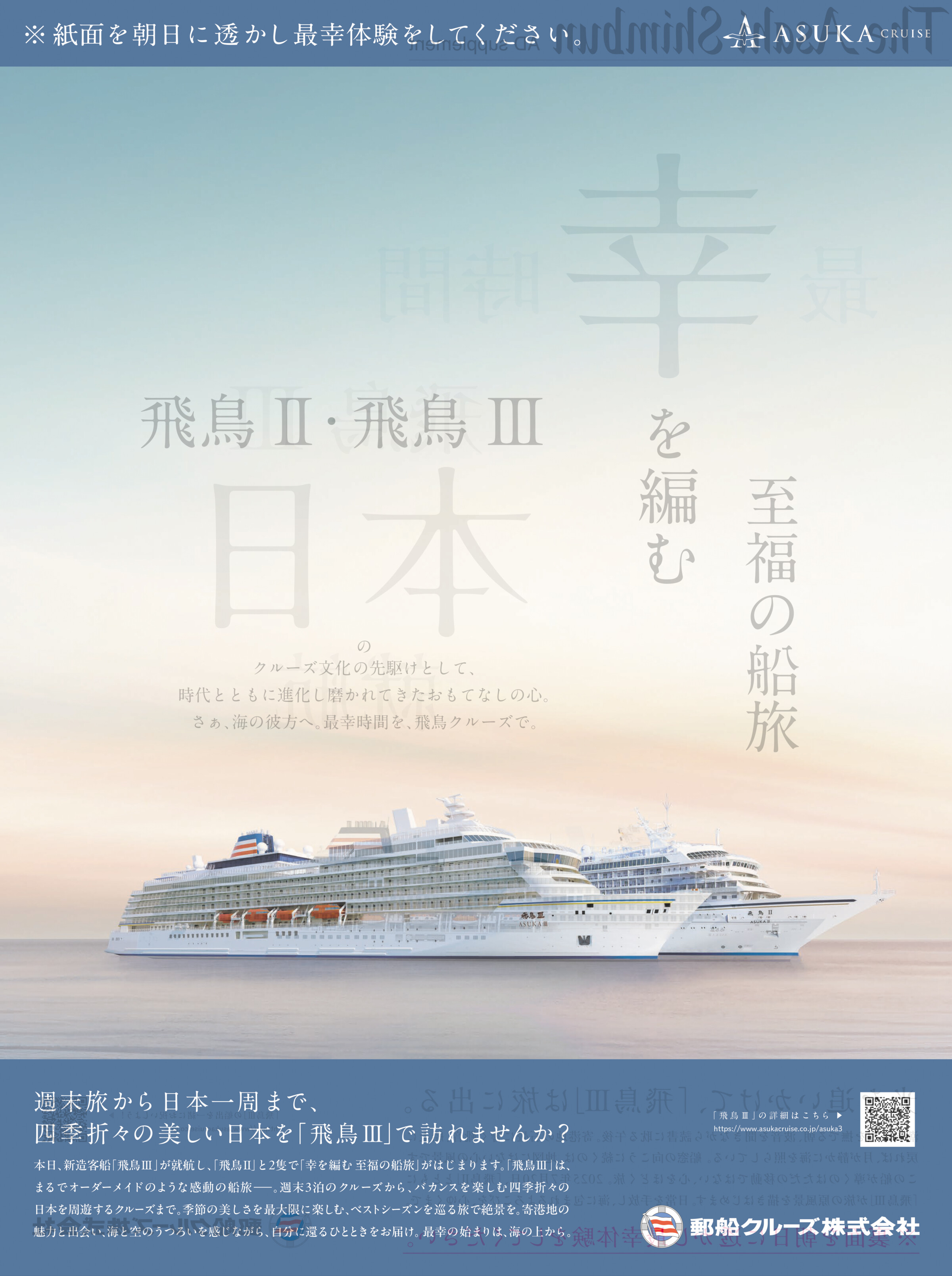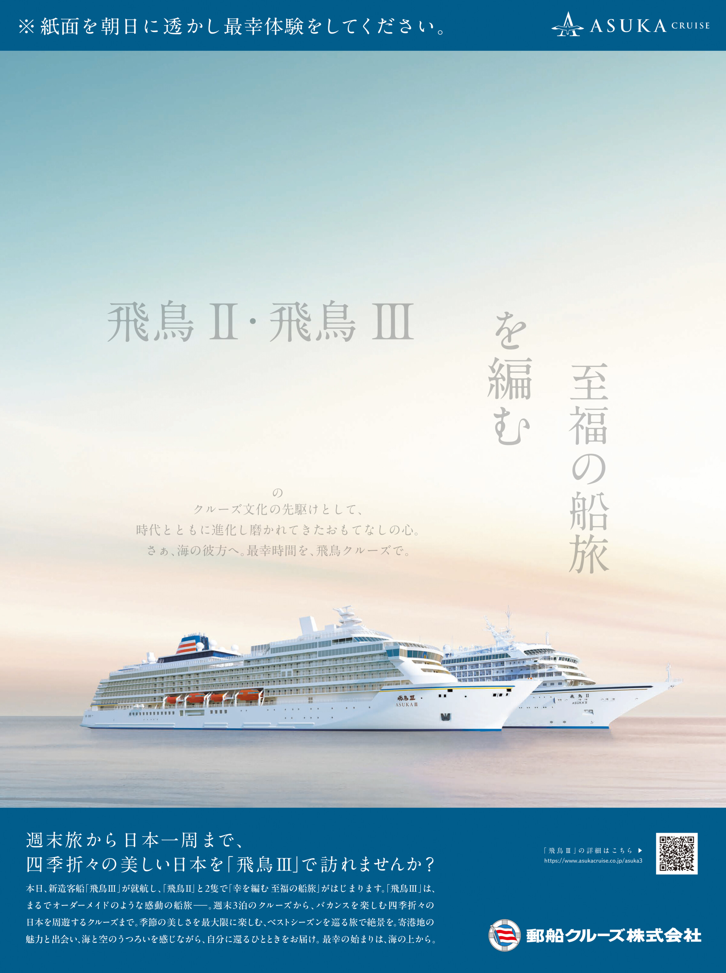 「飛鳥III」の就航と 「飛鳥II」と「飛鳥III」の2隻体制になることへの認知向上のため、新聞のギミックで話題化を狙ったクリエイティブ。「本日就航」、「幸を編む」をキーワードに構成し、太陽に透かすことで新たな文字が浮かび上がり、海上での最幸時間を擬似体験してもらう。