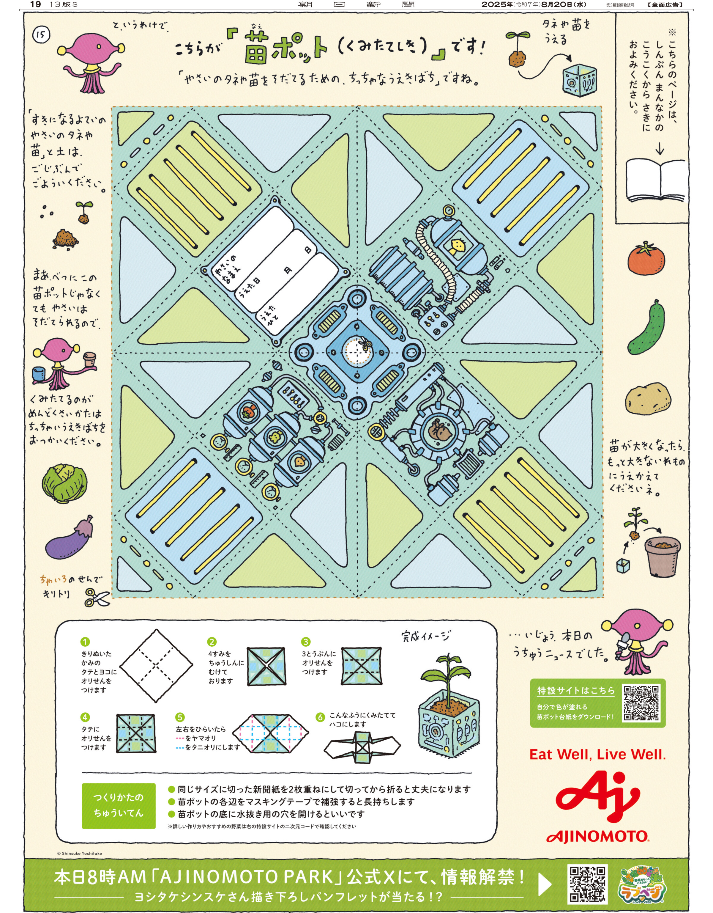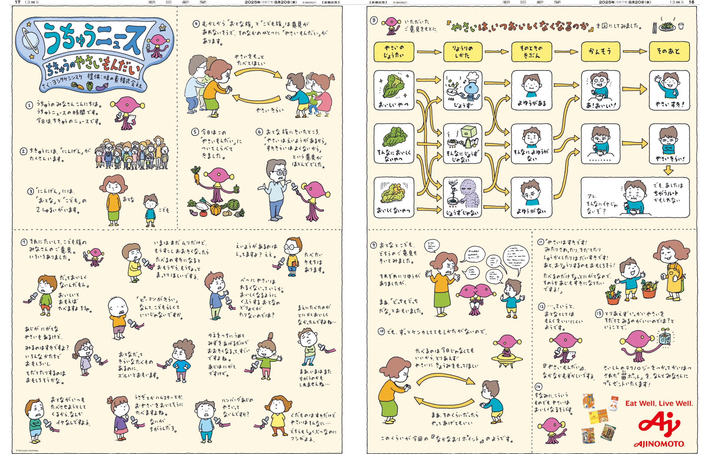 8月31日「野菜の日」に向けて、親子でもっと野菜に興味を持ってもらいたいという想いのもと、絵本作家・イラストレーター ヨシタケシンスケさんとコラボ。オリジナル描き下ろしストーリー「うちゅうニュース」を、8月20日(水)に「読んで・作って・育てる」体験型新聞広告として朝日新聞朝刊、特設ウェブサイトで公開。合わせてオリジナル描き下ろしパンフレットと味の素㈱製品がもらえるSNSキャンペーンも実施した。