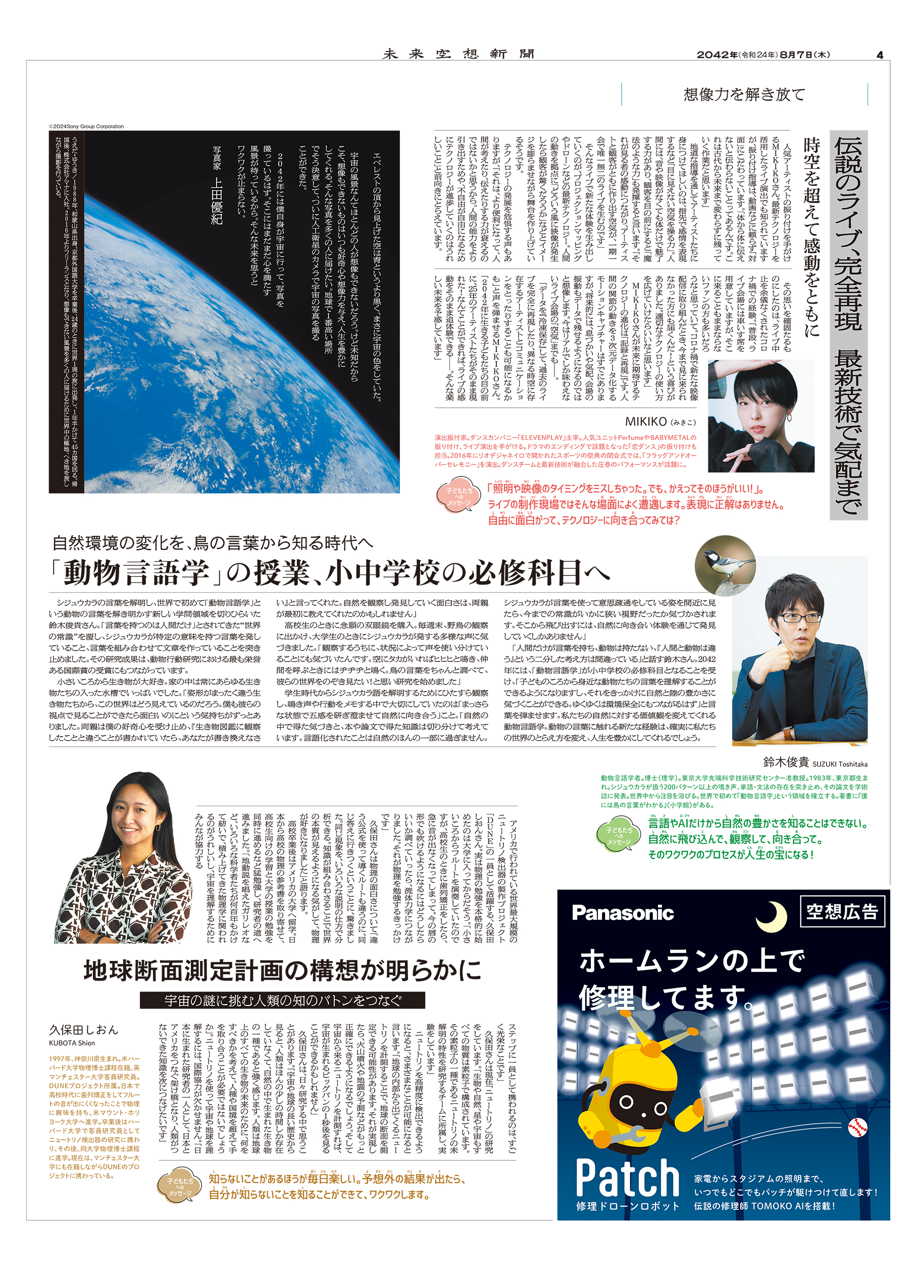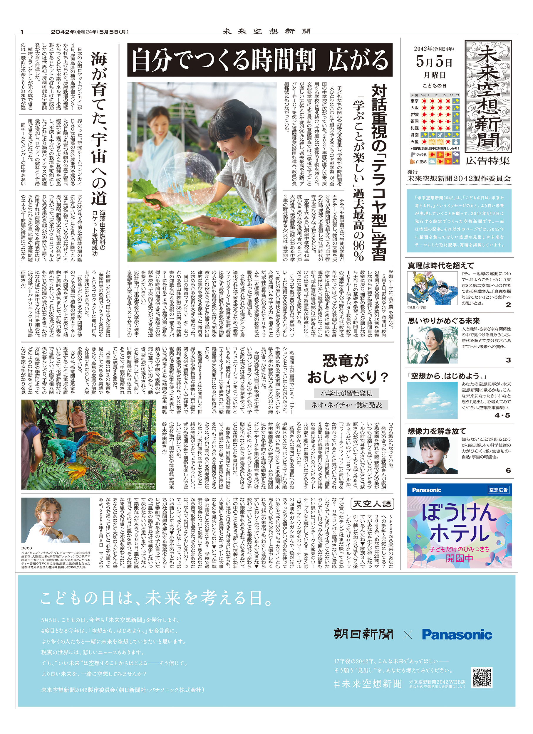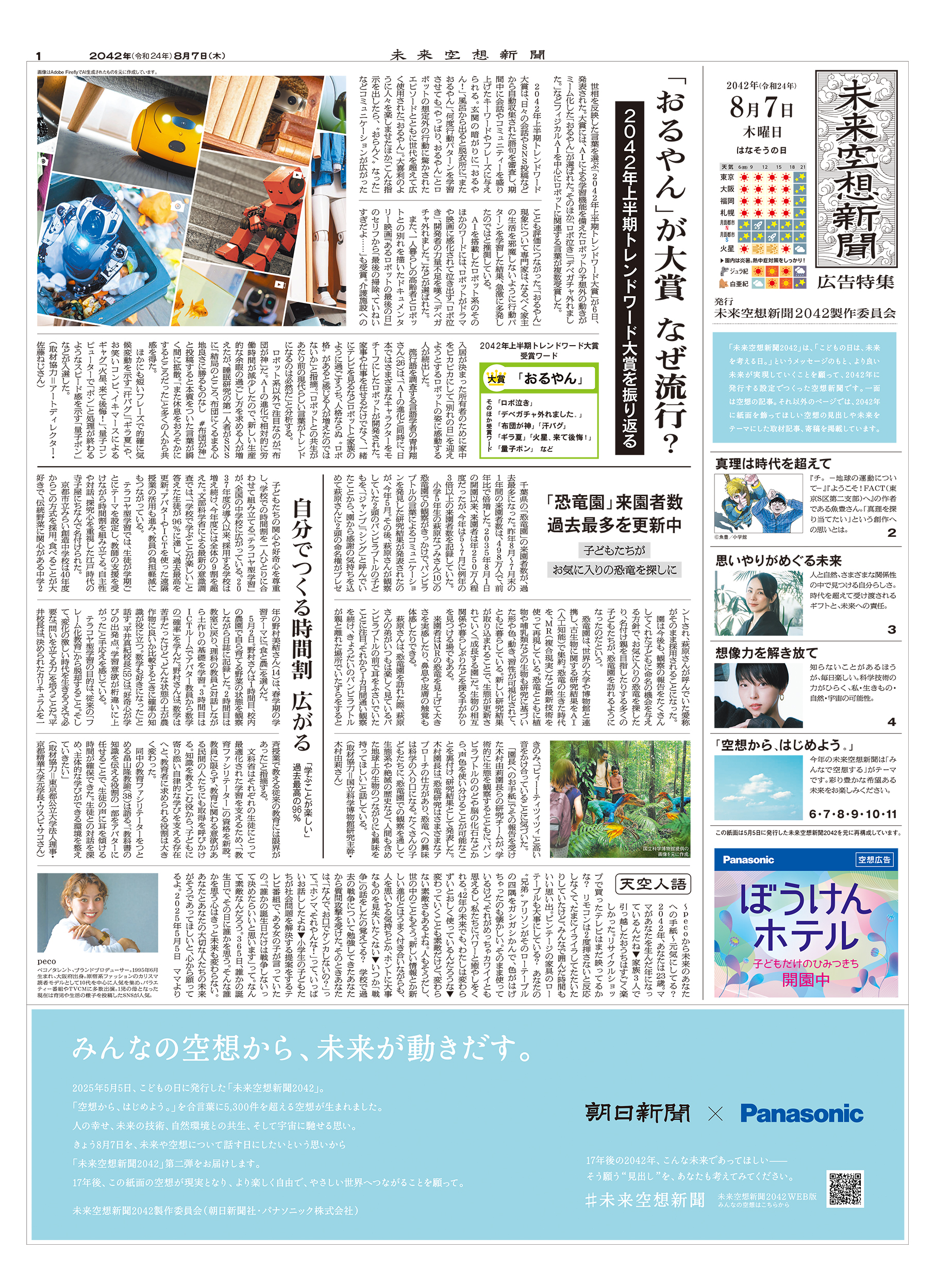 2022年にスタートしたパナソニック株式会社協賛の広告特集「未来空想新聞」。「こどもの日は、未来を考える日」というメッセージのもと、毎年5月5日に別刷りを発行してきた。2025年に発行した空想新聞は2042年の発行を想定。紙面には「未来を想う人」として35人をキャスティングした。さらにWEBで、読者も未来を空想できる新しい企画を展開。8月にはその内容を企画の第2弾として紙面とWEBにまとめた。