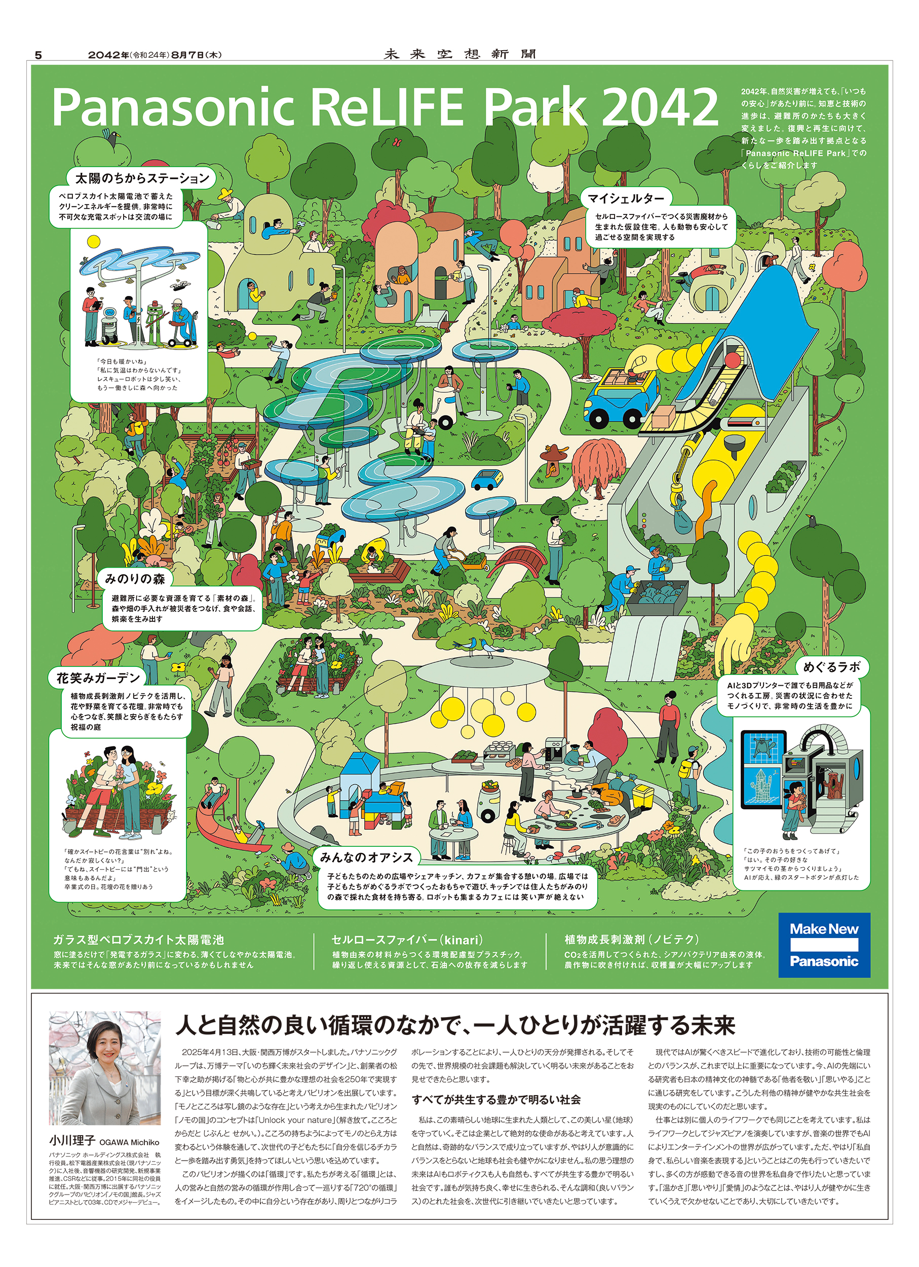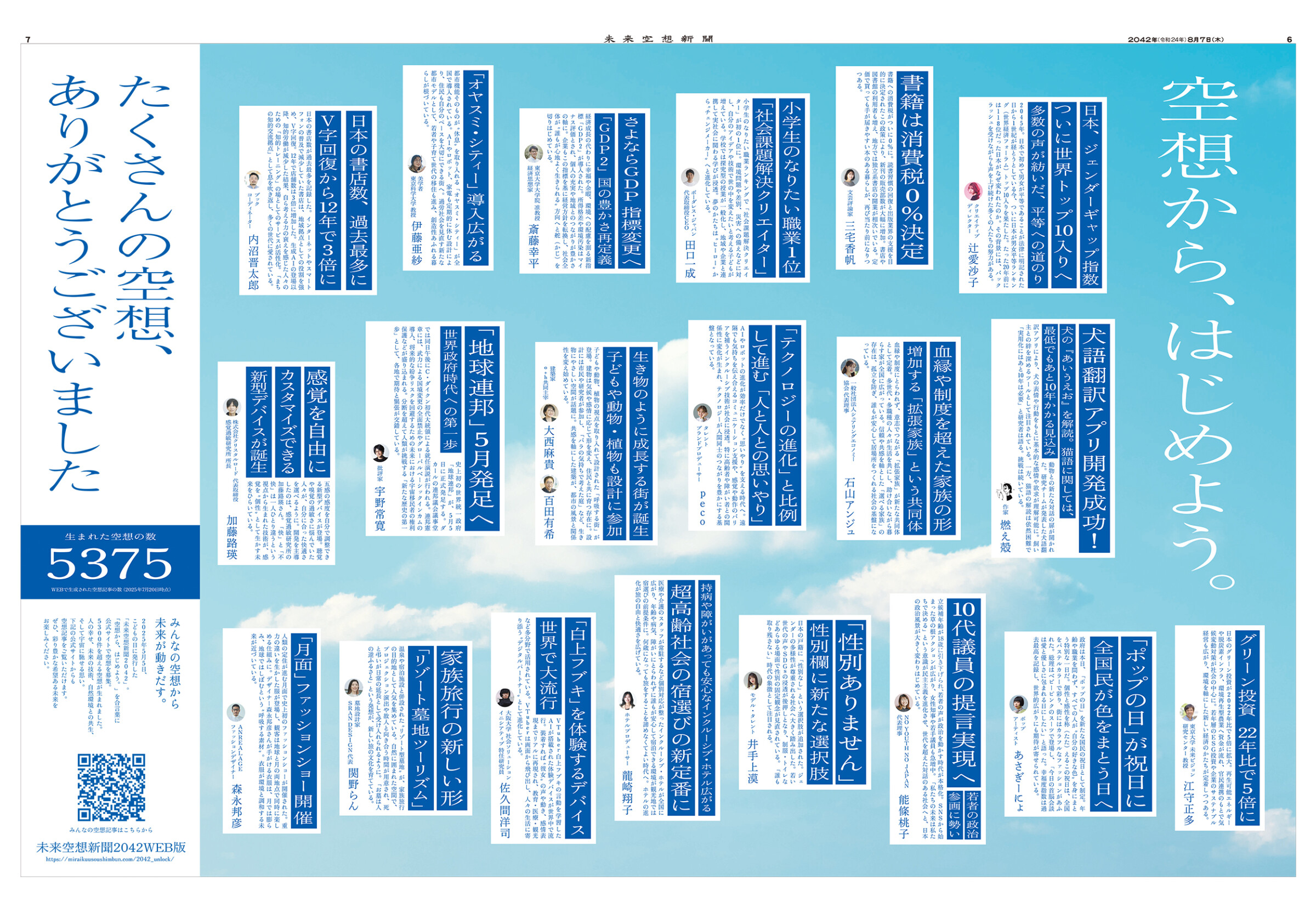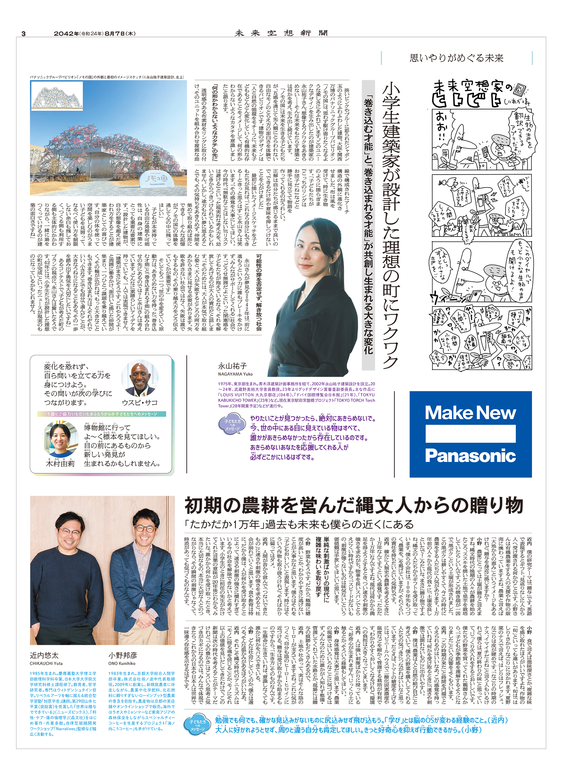 2022年にスタートしたパナソニック株式会社協賛の広告特集「未来空想新聞」。「こどもの日は、未来を考える日」というメッセージのもと、毎年5月5日に別刷りを発行してきた。2025年に発行した空想新聞は2042年の発行を想定。紙面には「未来を想う人」として35人をキャスティングした。さらにWEBで、読者も未来を空想できる新しい企画を展開。8月にはその内容を企画の第2弾として紙面とWEBにまとめた。