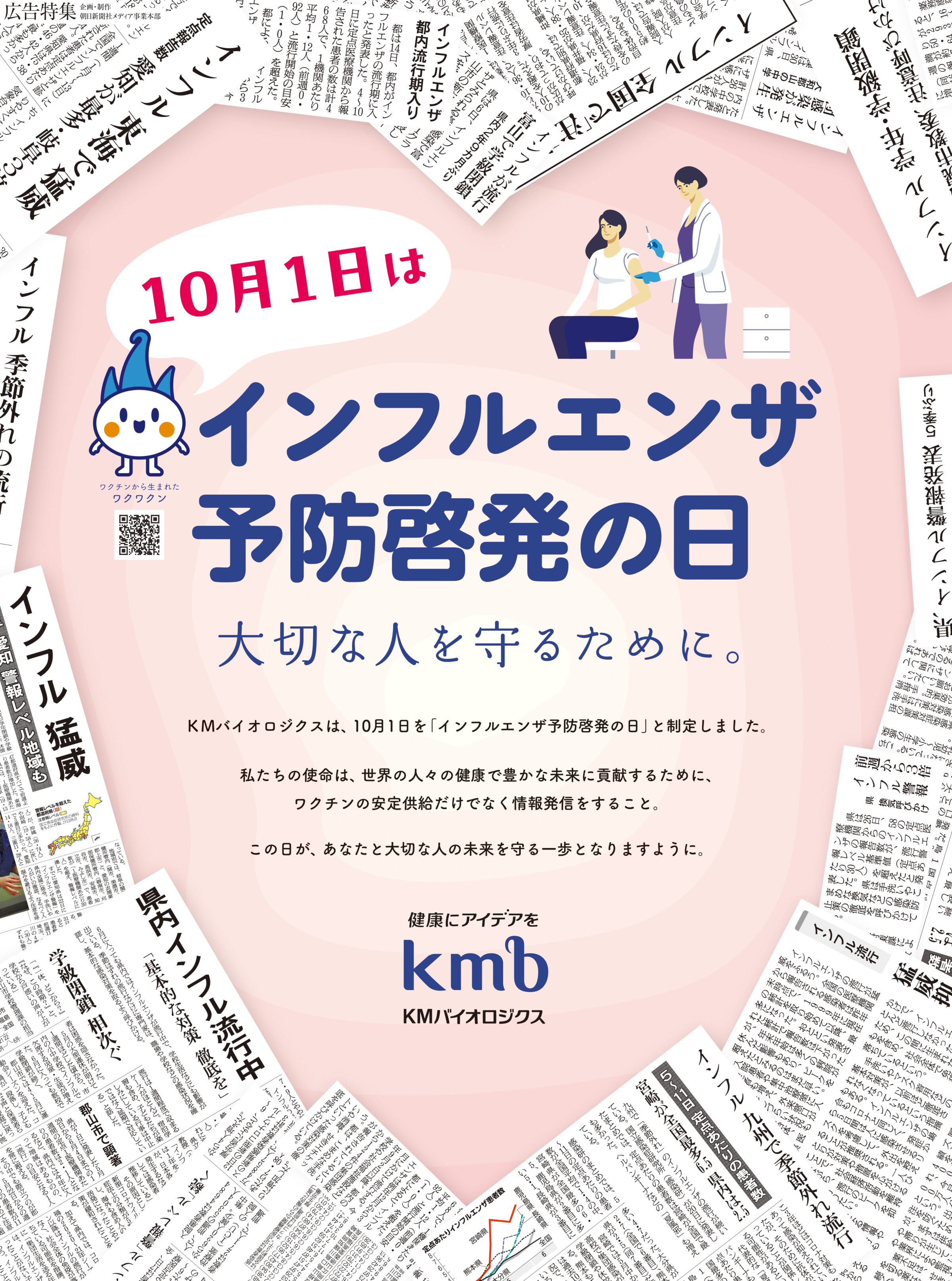 10月1日を「インフルエンザ予防啓発の日」と制定したKMバイオロジクス。その紙面広告として、膨大にある朝日新聞のこれまでの紙面を活用した事例。キャッチコピーを「大切な人を守るために。」として、インフルエンザ予防が自分のためだけでなく、まわりのためになるということをストレートに訴求。紙面デザインは、「大切な人」「守る」につながるハート型に。そのハートを形づくる過去紙面は、毎年インフルエンザが流行してきたことの気づきとなるように、「インフル」「流行」「猛威」など視認性が良い見出しの紙面を活用。朝日新聞社ならではの広告に仕上げた。