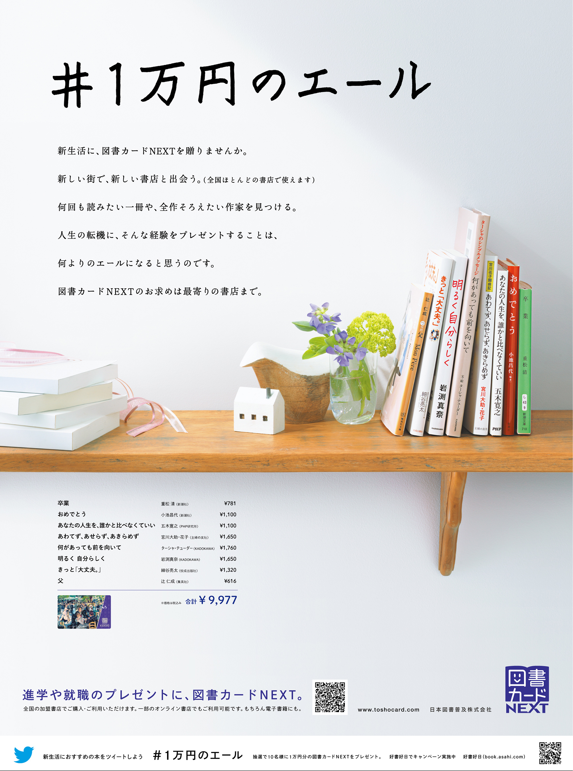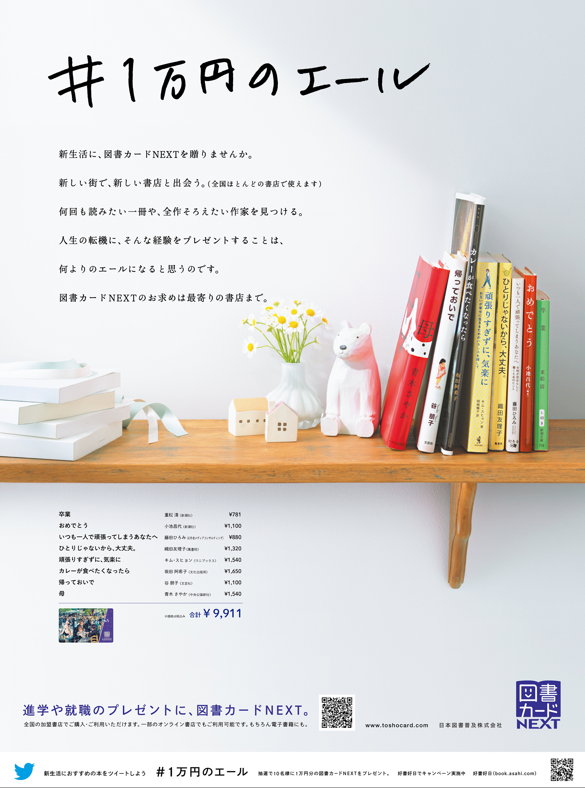 「#1万円のエール」。新生活のギフトシーズンに向けた図書カードNEXTの新聞広告。東日本、西日本エリアで別の原稿を掲載。合計1万円で購入できる本が棚に並び、本のタイトルをつなげると、母と父からのそれぞれのメッセージに。気がついたTwitterユーザーが写真をシェアしてくれたことで4000以上のいいね!がありました。さらにインフルエンサーを起用し、自身が選んだ1万円の選書をツイート。一般ユーザーが選書をツイートすることで抽選で図書カードNEXTが当たるキャンペーンもあわせて実施しました。