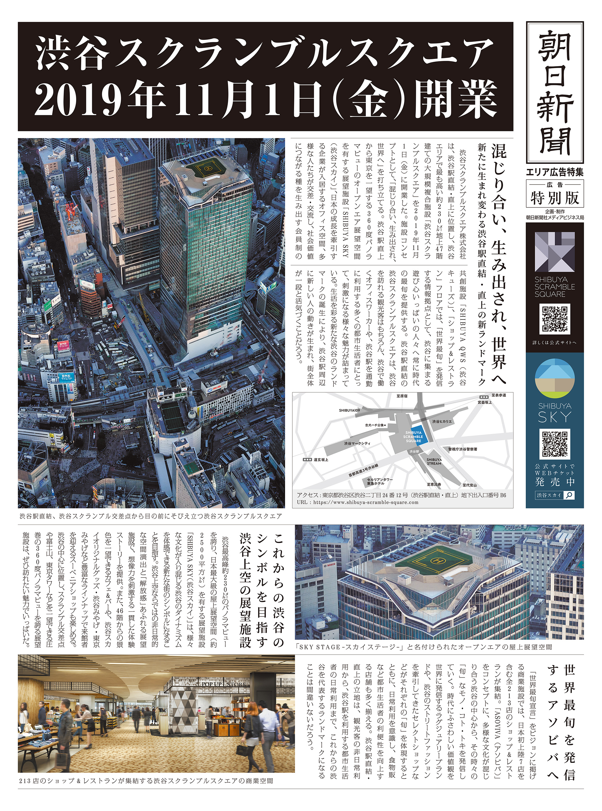 2027年まで続く渋谷再開発の大きな節目となる大規模複合施設「渋谷スクランブルスクエア」の開業記念企画。当初メディアプランになかった新聞広告の活用を、SHIBUYA SKYの企画、演出、広告に至るまでトータルのコミュニケーションデザインを担当しているライゾマティクスを通じて自主提案。「渋谷に新たなシンボルが誕生する」。このニュースは新聞広告との親和性が非常に高い、という提案内容に加え、本社ヘリでの空撮写真をメインビジュアルとした「広告号外パノラマ6」の紙面体裁が評価され実施に至った。開業日となる2019年11月1日には、渋谷近郊エリアへのポスティング(10万部)と、渋谷駅前での街頭配布(3,000部)を行い、SNSでも話題に。広告号外を手にとった人々が空を見上げながら話題にしている様子が特に印象的だった。紙面全体のアートディレクション、デザインをライゾマティクス、空撮パートの制作を朝日新聞社で担当した。